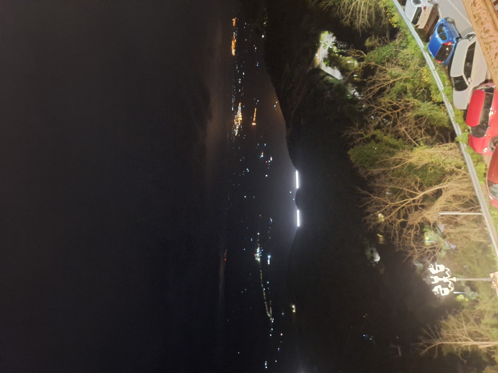 The image captures a nighttime view overlooking the city of Enna, Italy. A dark body of water extends to the left, and the lights of the city twinkle in the distance along the horizon. On the right side, a road lined with parked cars, including red, blue, and white ones, is visible. Trees and foliage are interspersed along the road, illuminated by streetlights. Some lights are visible in the trees.