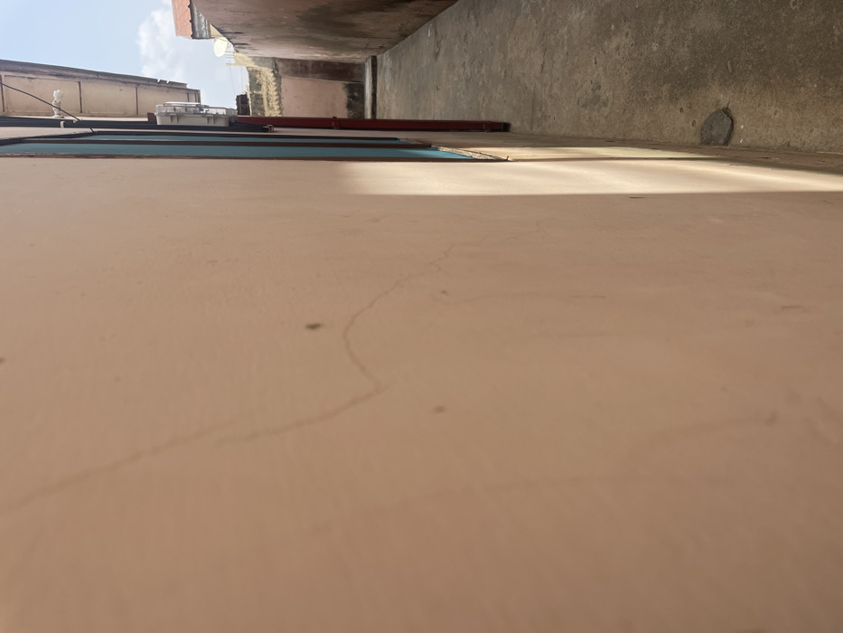 The image displays a narrow, concrete-paved alleyway between two structures in the city of Accra, Ghana, illuminated by direct sunlight under a pale blue sky with some cloud cover. The left side of the frame is dominated by a pale peach-colored building wall exhibiting faint vertical and horizontal water stains and several small dark marks. A light-blue vertical trim, likely part of a window or door frame, runs down the right edge of this wall, partially enveloped by a sharp diagonal shadow. On the alleyway ground, near the base of the left wall in the shadow, a small, dark, irregular object, possibly a stone, is present. The right side of the alley features another building wall, appearing a darker orange-brown and also showing signs of staining. A red vertical pipe is mounted to this wall. Further up and to the right, a white rectangular electrical meter box and a white light fixture are affixed to the building's exterior. In the far upper right background, a red-tiled roof and a small white satellite dish are visible. The scene is devoid of people, specific actions, or visible interactions.