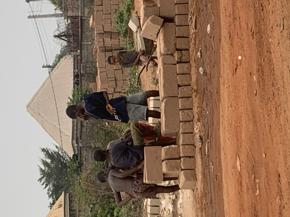 This image, captured in Aguleri, Nigeria, depicts an outdoor scene dominated by five males of varying ages, ranging from young children to adolescents, on a red-brown dirt surface under an overcast sky. In the midground, a substantial quantity of reddish-brown, unfired mud bricks are stacked in various formations, forming low walls and piles. A group of four individuals is situated around a segment of these brick stacks on the left and center. One boy, shirtless and wearing patterned shorts, stands on the far left. Adjacent to him, another boy in a dark shirt and patterned shorts sits on a brick stack, with a third individual, partially obscured by the sitting boy and wearing a red garment, positioned behind him. To their right, a fourth boy, dressed in a dark blue short-sleeved shirt with white trim and grey shorts, stands with his right hand near his face and his left arm behind his back. On the right side of the frame, a smaller boy, wearing a striped t-shirt and patterned shorts, sits on a metal wheelbarrow. The background features a low concrete block wall, topped with what appears to be barbed or razor wire. Beyond this wall, several structures are visible, including a building with a light-colored, steeply pitched metal roof, and another building with a flatter light-colored roof to the left. Sparse green vegetation, including a tree, is also present behind the wall. The foreground ground surface exhibits scattered debris, including small pieces of plastic and other refuse.