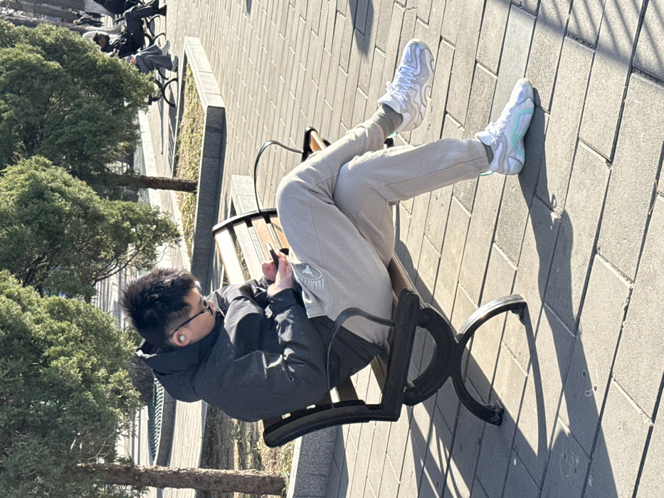 A young person in a gray jacket and light-colored sweatpants reclines on a black park bench, gazing at a mobile phone. The individual wears glasses and white earbuds. The person's legs are crossed, with white athletic shoes resting on the pavement. A brick walkway extends into the background, partially shaded by nearby trees. Sunlight casts sharp shadows of the bench and the person onto the walkway. Bicycles are visible in the distant background.