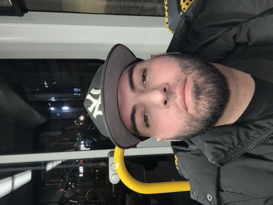 A man with a dark beard and a gray New York Yankees baseball cap poses for a selfie. He is wearing a black jacket and a black shirt. A yellow handrail and window are visible in the background, revealing lights that could be from a city at night. The photo has been rotated.