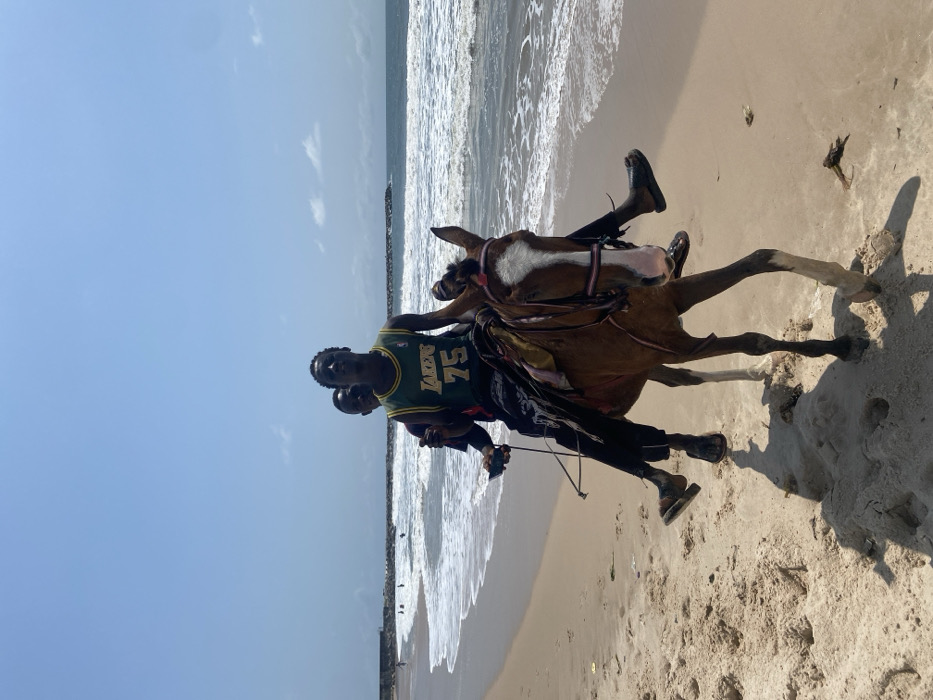 The image depicts two individuals riding a brown and white horse on a sandy beach under a clear blue sky in Alaguntan, Nigeria