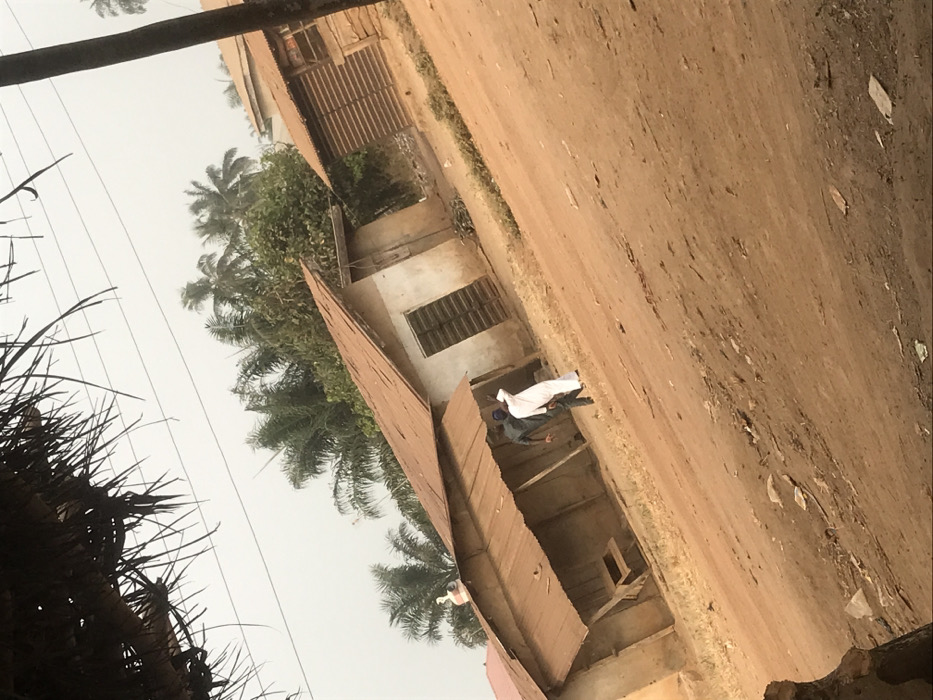 A street scene in a rural area is depicted. Buildings with corrugated metal roofs line a dirt road. Palm trees dot the landscape. Two figures are visible in front of one of the buildings, possibly engaged in conversation. The sky is overcast, suggesting a hazy or cloudy day. Vegetation is sparse. Overall, the scene conveys a sense of simplicity and modest living conditions.