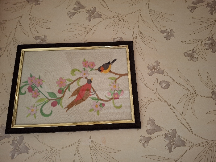 framed embroidery artwork hanging on a beige wall with a floral pattern. The embroidery depicts two birds perched on a blooming branch, with a red bird on the left and a yellow bird on the right. The artwork is framed with a black frame with a gold inner border. The image was taken in Rustavi, Georgia, at the location of the coordinates provided.
