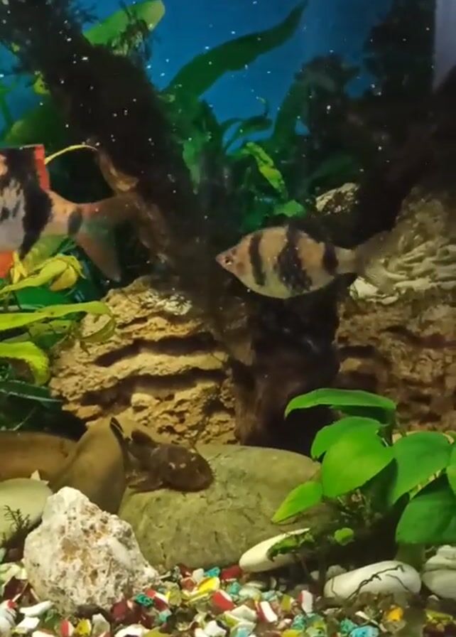n aquarium with several fish swimming around plants, rocks, and a skull decoration. The fish include a Harlequin Rasbora, a Tiger Barb, and small red tetras. The aquarium substrate is a mix of colorful gravel and shells. There is also a filter visible in the background.