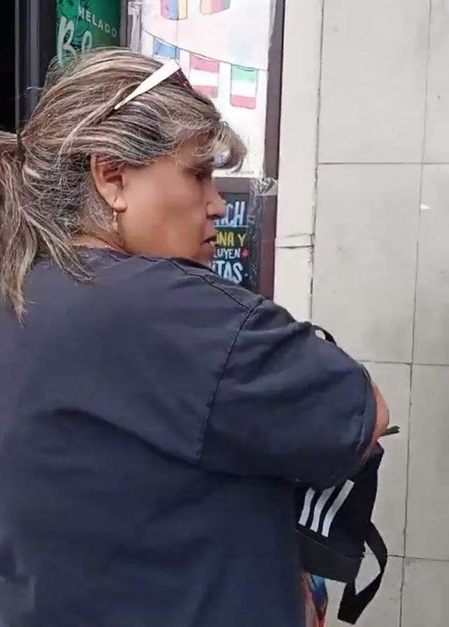 street scene in front of a restaurant or eatery. Several people are present, walking along the sidewalk and sitting at tables under an awning. One woman is seen rummaging through a black Adidas backpack. The front of the business has several signs advertising sandwiches, ice cream, and other food items, with a menu written on a chalkboard. Some individuals are wearing masks, and a few people are standing or sitting near the entrance of the establishment. There is music playing in the background.