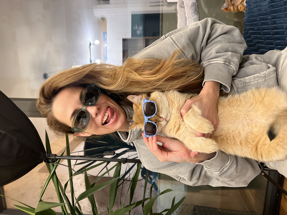 This image depicts an indoor scene in the city of Bar, Montenegro, likely within a private residence. One adult female, characterized by light brown hair and wearing gray casual attire and green-tinted sunglasses, occupies the central foreground. She displays a playful expression, smiling broadly with her tongue extended, looking directly at the camera. She is holding an orange/ginger cat with both hands, positioning it in front of her. This cat is wearing small, light blue-framed sunglasses, and its eyes appear closed or squinted. A second orange/ginger cat is partially visible in the lower right background, situated on a blue textured surface. The background features a large green leafy plant, a black photography light diffuser on a stand to the left, and a reflective surface, possibly a window, on the right. This reflection reveals a modern interior space, potentially a kitchen, with white cabinetry and overhead lighting.