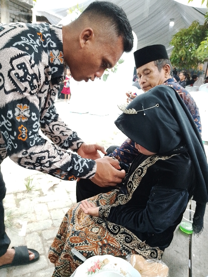 An outdoor scene in Juwana, Indonesia, shows three individuals participating in what appears to be a ceremony or event. In the foreground, a man with short, dark hair, wearing a cream, black, and orange patterned batik long-sleeved shirt and black sandals, leans down. He is using both hands to adjust a detail on the left arm or wrist of a young girl seated in front of him. The girl wears a black headscarf adorned with a gold leaf-shaped pin, a black velvet dress with gold embroidery, and a brown and gold patterned sarong-like garment. She is looking downwards. Behind and to the right of the girl, an older man wearing a black peci (cap) and a blue and brown patterned batik shirt observes the interaction, his right hand resting near his chin. In the immediate foreground, a white plate with a floral design rests on a wooden surface, holding an item wrapped in clear plastic. A clear cup containing a green liquid is visible nearby. The background features a white canopy or tent structure overhead, green foliage, and blurred figures of other attendees, suggesting a gathering. The ground is a light-colored surface, possibly paved, with sparse weeds visible.