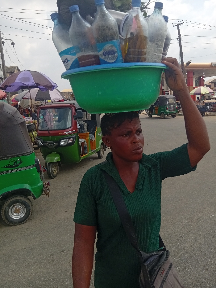 A dark-skinned woman is depicted walking on an asphalt street in Ura Nta Umuarandu, Nigeria, carrying a light green plastic basin on her head. Her left arm is raised, with her hand stabilizing the basin. She wears a dark green, ribbed short-sleeved top and a black shoulder bag, with her gaze directed towards the right. The basin contains multiple plastic bottles, some clear with "EVA" labels, others filled with various dark liquids or substances. In the background, several green and red auto-rickshaws (tricycles) are present. To the left, a market area features stalls and a purple and white striped umbrella. Overhead power lines are visible across the sky. In the distance, buildings, including what appears to be a petrol station, are discernible under an overcast sky.