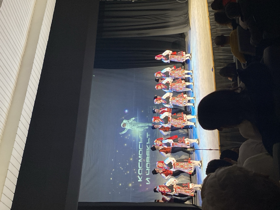 This image captures an indoor performance on a stage within an auditorium in Shumen, Bulgaria. The stage background features a large projection screen displaying an astronaut floating in space against a starfield, above the Bulgarian text "КОСМОСЪТ И ЧОВЕКЪТ," translating to "The Cosmos and Man." On the stage, approximately fifteen individuals are present: seven males and eight females. The female performers wear traditional Bulgarian folk costumes, including white blouses, intricately embroidered black vests, patterned full skirts, red headscarves or floral wreaths, and white footwear. The male performers are dressed in white shirts, dark vests, dark trousers, and dark hats, some with red accents. A single microphone stand is positioned on the stage floor. Dark stage curtains are visible on both sides. The foreground shows the backs of several audience members seated in dark auditorium chairs, observing the performance. The stage is brightly illuminated, while the audience area is darker. A white, ribbed ceiling structure is partially visible at the top of the frame.