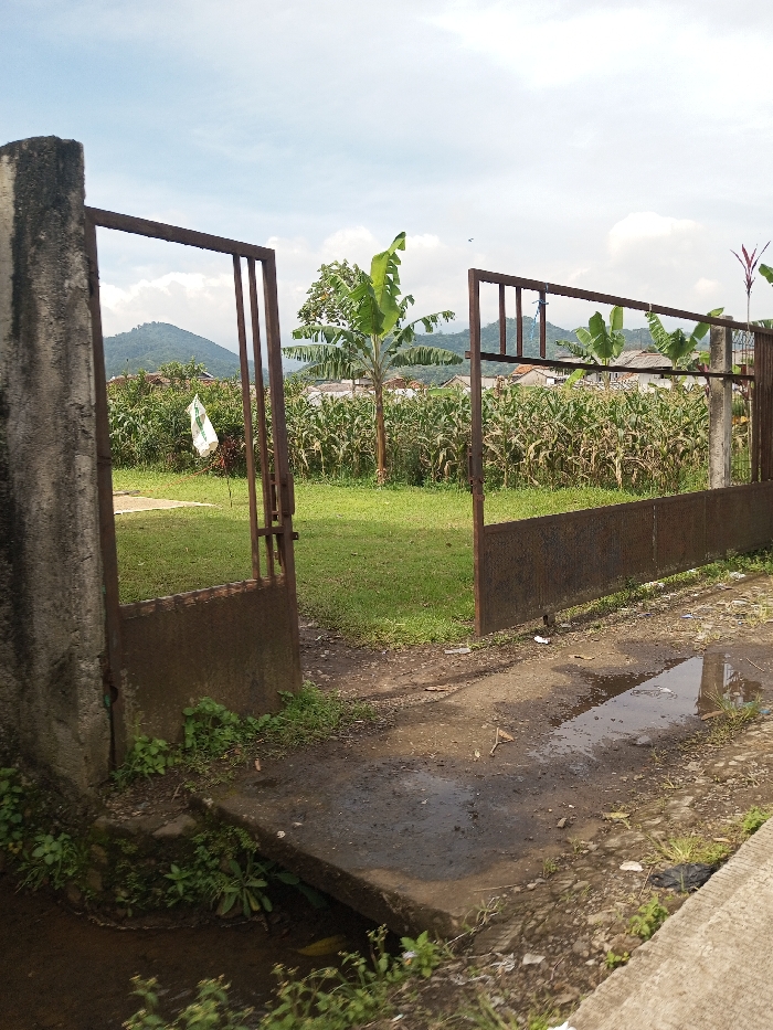 This image, taken in Kandenuwara, Sri Lanka, displays an outdoor scene through an open, rusty metal gate