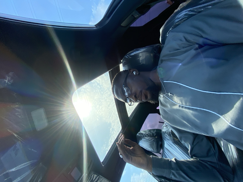 A male subject is seated in the front passenger seat of a vehicle in Igboefon, Nigeria. The subject is an adult male with dark skin, a beard, and short dark hair, wearing black-rimmed glasses and white wireless earbuds in both ears. He is dressed in a grey traditional Nigerian garment featuring white piping details and a silver chain with a cross pendant around his neck. A silver-colored ring is visible on his left ring finger. His left hand is raised, with fingers slightly spread, positioned near the vehicle's interior roof. The vehicle features a dark interior and an open panoramic sunroof, through which a bright sun, causing significant lens flare, is visible against a blue sky with scattered white clouds. The front passenger seat and the seat directly behind it are covered in clear plastic protective wrapping. The vehicle's headliner also shows signs of protective plastic sheeting near the windshield. Faint power lines are visible through the sunroof against the sky.