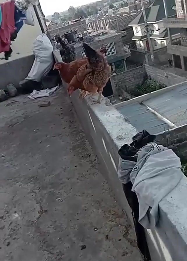 several chickens walking on a rooftop. The chickens are brown and black. The rooftop is gray and has clothes hanging on a line. In the background, there is a cityscape with buildings. The sky is overcast.