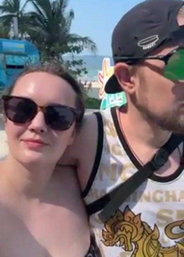A fair-skinned woman with sunglasses, wearing a leopard print swimsuit top, stands in sunlight with her head resting on the shoulder of a fair-skinned man. The man is wearing sunglasses, a black baseball cap, and a white jersey with a tiger design. A black strap is across his body. The background is a sunny beach scene with palm trees, a blue structure, and people on the beach in the distance. They appear to be walking and the camera is slightly shaky.