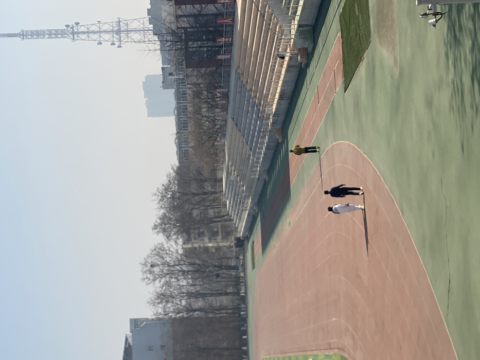 A high-angle shot shows an outdoor sports track with a stadium beside it. Three people are walking on the track. Buildings and a tall transmission tower are visible in the background. The sky is light and hazy. The track has a reddish-brown surface with green surrounding it. Shadows are cast by the people walking on the track. Bare trees line the left side of the track.