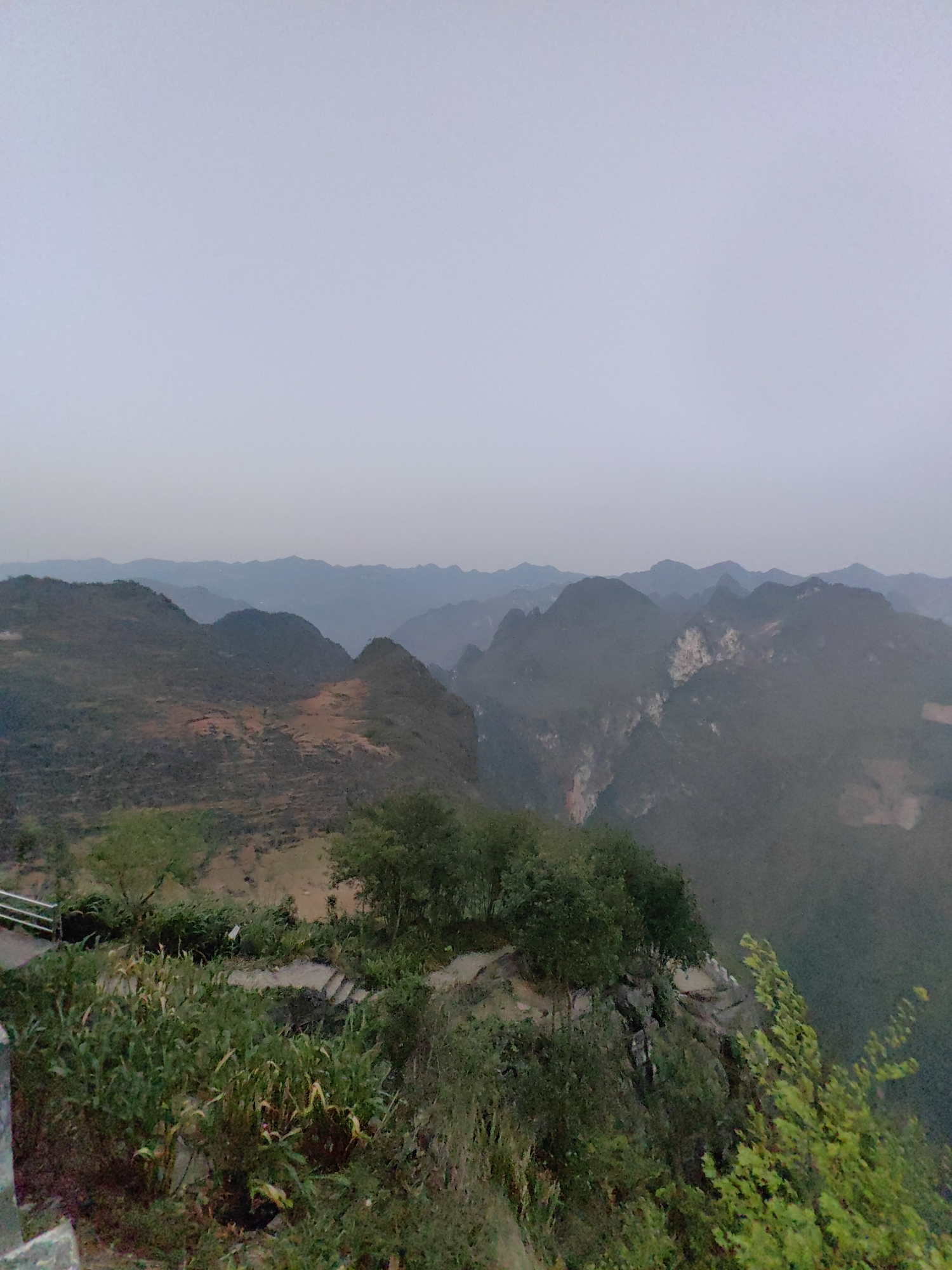 The image captures a landscape in Mèo Vạc Commune, Vietnam, dominated by mountainous terrain. Layered hills and mountains fade into the hazy distance under an overcast sky. The foreground features lush vegetation, including trees and plants growing on a rocky slope. A small section of a metal railing suggests a viewing point or pathway.
