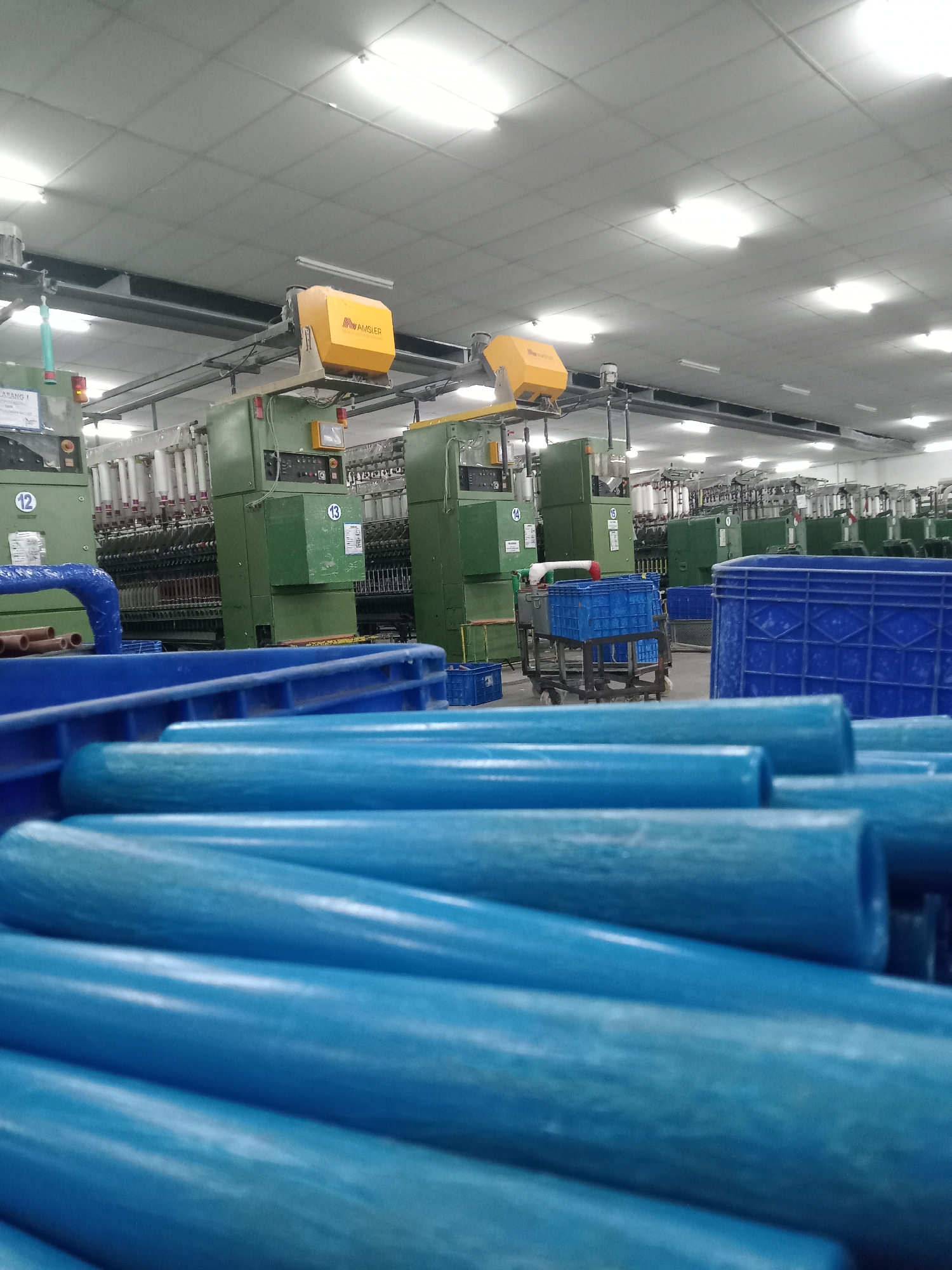 The image captures an interior view of an industrial manufacturing facility, identified as being located in Nglundo, Indonesia. The foreground features a close-up, slightly out-of-focus stack of numerous cylindrical blue objects, consistent with empty bobbins or yarn cones. Partially visible blue plastic crates are also present in the immediate foreground. In the midground and background, a large, well-lit factory floor is visible, populated by multiple rows of heavy industrial machinery. These machines are predominantly green in color and appear to be textile or yarn processing equipment, featuring numerous spindles, some holding white spools of yarn. Several machines display yellow overhead units with the "WAMSLER" brand visible. Individual machines are marked with numbers such as '12', '13', '14', and '15'. Blue plastic crates are interspersed throughout the machine rows, with one crate positioned on a wheeled cart. A blue pipe or conduit is visible on the left side, extending from one of the green machines. The facility's ceiling is white, constructed from square acoustic tiles, and is extensively illuminated by multiple recessed rectangular fluorescent light fixtures. Overhead ductwork or conveyor systems run above the machinery. No individuals are visible within the scene.