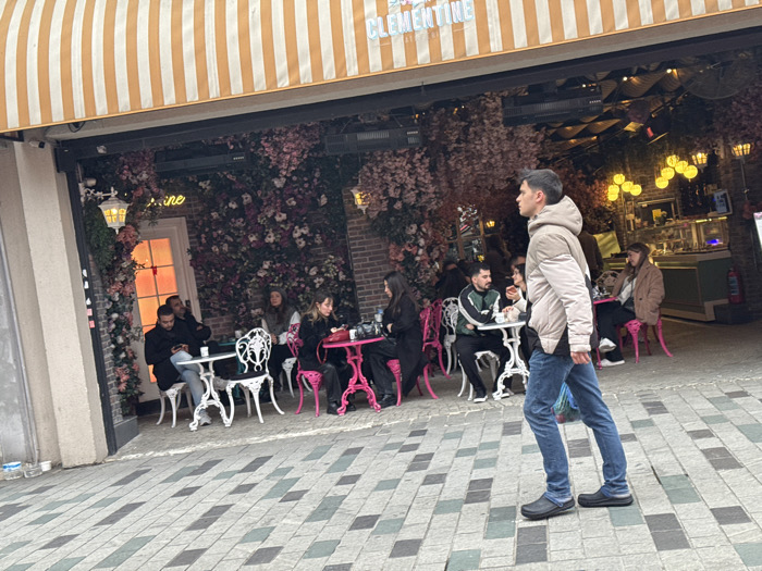 The image depicts an outdoor seating area of a cafe named "CLEMENTINE" located in Beyoğlu, Turkey. The cafe features a prominent orange and white striped awning and a brick facade extensively covered with artificial pink and purple floral and vine decorations, including a neon "Clementine" sign. Black heat lamps are mounted beneath the awning. In the foreground, a young adult male walks from right to left across a paved street with a geometric pattern of light and dark grey rectangular tiles. He wears a light beige hooded jacket, blue jeans, and black clogs, with his head turned slightly to his left. Several patrons are seated at white and bright pink metal tables and chairs outside the cafe. On the left, a male in a dark coat is seated at a white table, looking at a mobile phone. Another male and a female are seated near him. Further right, a female with long dark hair, wearing a black top and pink boots, is seated at a pink table. Other individuals are distributed across the tables, some engaging in conversation or looking at phones, with visible cups and drinks. The interior of the cafe, visible through an entrance, shows additional lighting and display counters. A small blue object, possibly a bucket, rests on the sidewalk near the left frame edge.