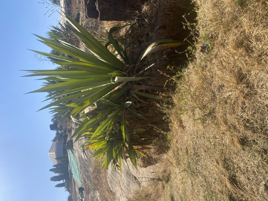 A vibrant green agave plant with long, pointed leaves grows from the rocky hillside. Adjacent to it, dry brown grass covers the ground. In the background, a building with trees is partially visible on the left, set against a clear blue sky. The landscape appears arid, with sunlight highlighting the textures of both the plant and the surrounding terrain.