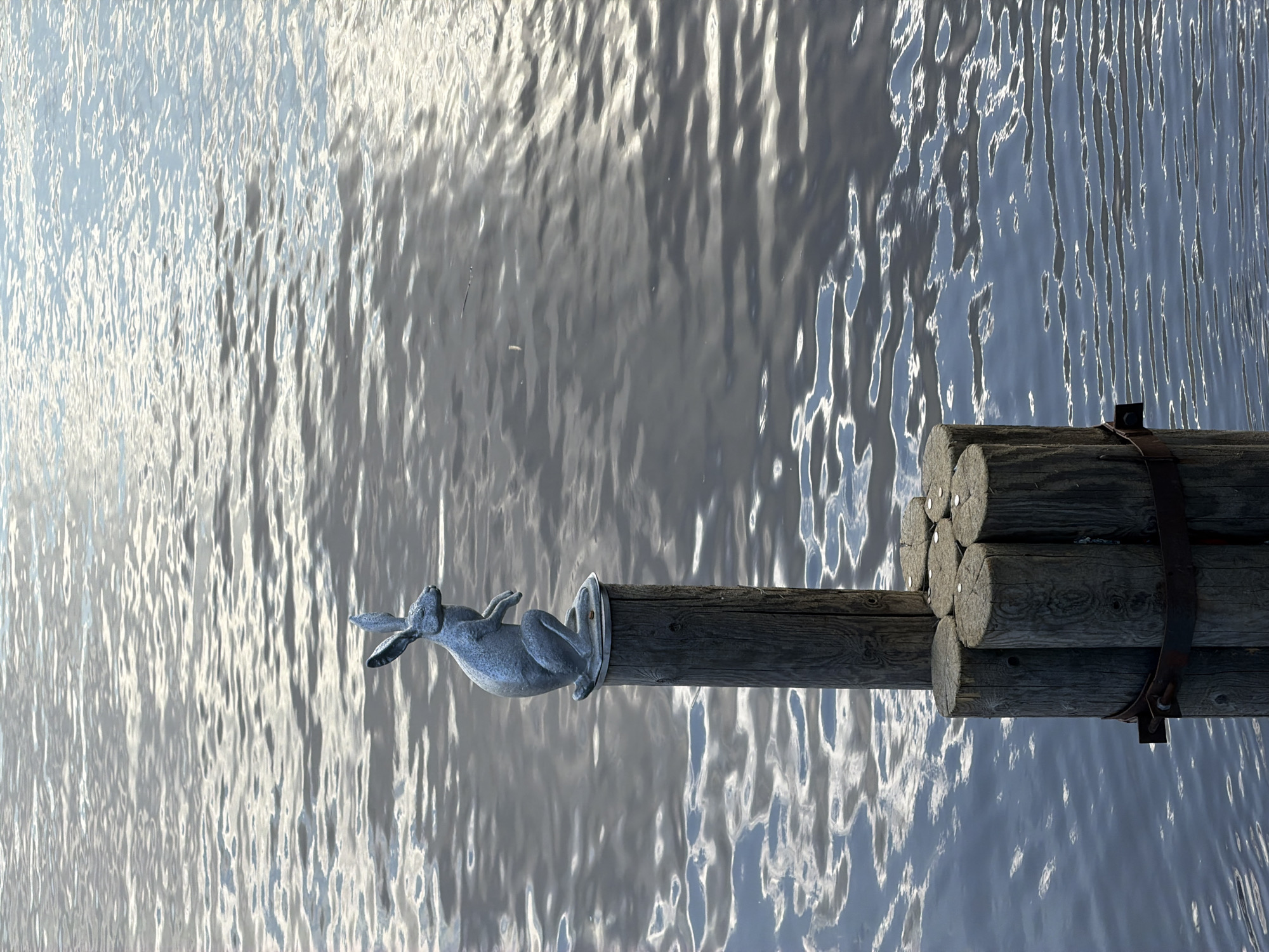An metallic hare sculpture stands upright on its hind legs, front paws slightly raised, atop a single weathered wooden pile protruding from a body of water