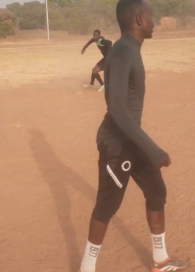 Several people are engaged in a sports activity on a dry, reddish-brown dirt field. They are wearing athletic attire, including soccer jerseys and shorts. Some of the players are wearing the number "50" or "10." There is a blue cone on the ground. The background consists of trees and a light grey sky. The camera is angled, making the scene appear rotated.