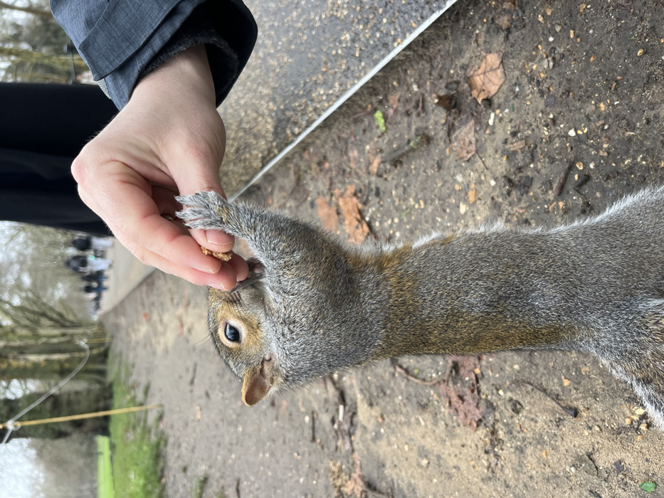 The image captures an Eastern Grey Squirrel (Sciurus carolinensis) standing upright on its hind legs on a dirt ground, facing left. The squirrel, predominantly grey with a brownish-orange hue on its back, is actively retrieving a small, light-brown food item (appearing to be a nut or seed) from the fingers of a human right hand, which extends into the frame from the upper right. The person's forearm, covered by a dark grey jacket sleeve, is partially visible. The ground is dark, damp earth interspersed with scattered dry brown leaves and small twigs. In the background, a wide, tree-lined dirt or gravel path extends into the distance, populated by several blurred human figures. The mature deciduous trees (likely plane trees) lining the path appear largely bare, suggesting an autumn or winter season. A metallic-looking strip, possibly a path edge or a bench component, is visible along the lower right side. A thin white line, possibly a string or wire, is stretched across the upper left background between trees. This scene is located within a public park in the City of London, United Kingdom, consistent with characteristics of St. James's Park.