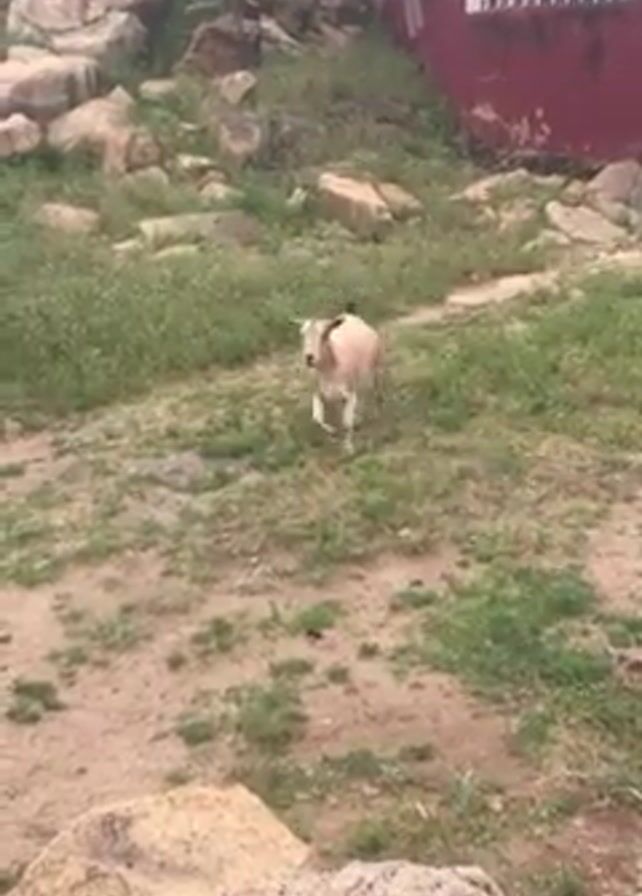 goat walking toward the camera across an outdoor area with rocks and green vegetation