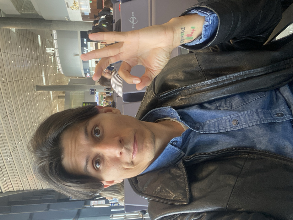 This image depicts a male individual taking a selfie within Tocumen International Airport, located in Tocumen, Panama. The subject, a male with dark hair parted in the middle, dark eyes, and light-to-medium skin tone, occupies the foreground. He is wearing a black leather jacket over a blue denim button-up shirt, with a light-colored undershirt and a thin silver-colored chain necklace visible. His expression features wide eyes and a slight smirk. His right hand is raised to chest level, forming an "OK" gesture with the thumb and index finger creating a circle, and the other three fingers extended. On the inside of his right wrist, a tattoo is visible, displaying the word "Ditch" (oriented to be read when the arm is rotated) followed by green and red candlestick chart symbols. The background reveals a spacious, well-lit airport terminal. High ceilings with a grid pattern and numerous recessed lights are visible. Large windows line the left side, admitting natural light. Rows of grey airport seating are present, some occupied by other indistinct individuals. Crucially, a sign clearly displaying "Tocumen" is visible on the back of one of these seats, confirming the location as Tocumen International Airport. Further in the background, commercial signage, including a partial "shop" sign and a yellow sign marked with the number "1," is present, along with architectural columns and other distant figures.