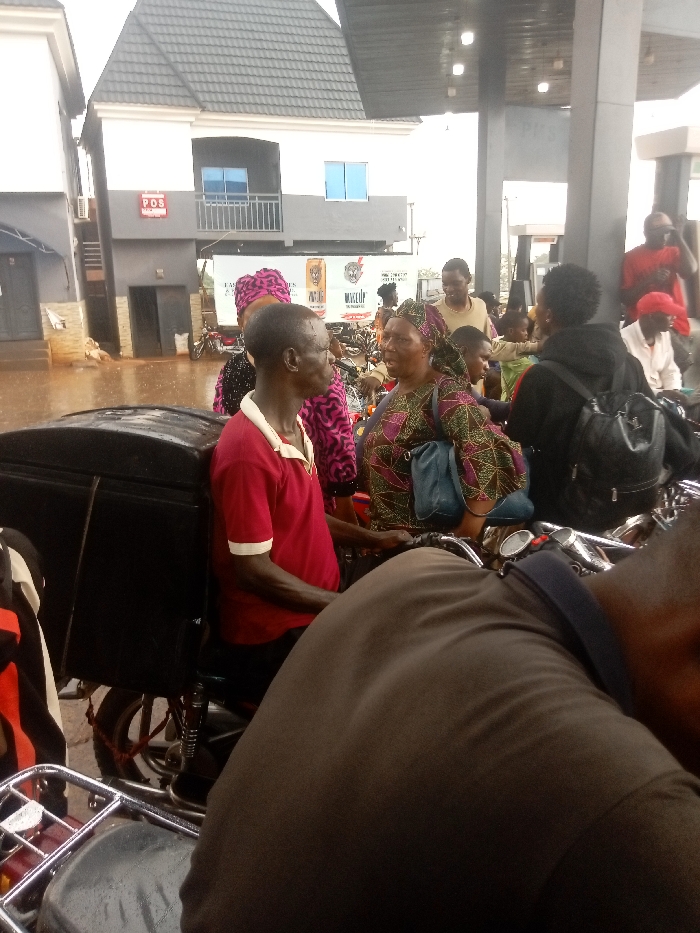 A crowded outdoor scene shows several people gathered near motorbikes. A man in a red polo shirt sits on a motorbike. Beside him, a woman in a patterned headscarf and dress engages in conversation. Other people are present, some wearing head coverings or backpacks. A building with a "POS" sign is visible in the background, along with advertisements. The scene suggests a bustling environment, possibly a public transportation hub or gathering point.