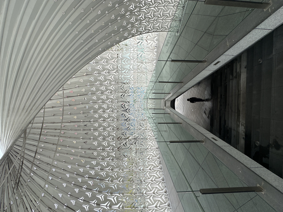 The image displays the interior of the Kunpeng Space Station in Liangjiang, China. A single individual, silhouetted and dressed in dark clothing, is observed walking away from the viewer, descending a central staircase into a lower, darker area of the facility. The central descent is flanked by two elevated walkways featuring dark tiled surfaces and transparent glass balustrades with dark support posts. Chinese characters, "鲲鹏空间站," are visible on the glass balustrade to the right. The prominent architectural feature is a large, high, curved ceiling and wall system composed of light-colored, possibly metallic, panels. These panels exhibit a repeating, intricate geometric perforation pattern resembling a stylized three-pronged star, allowing light to filter through and create subtle reflections of color from the background. The environment is modern, expansive, and constructed primarily in shades of gray, silver, and black.