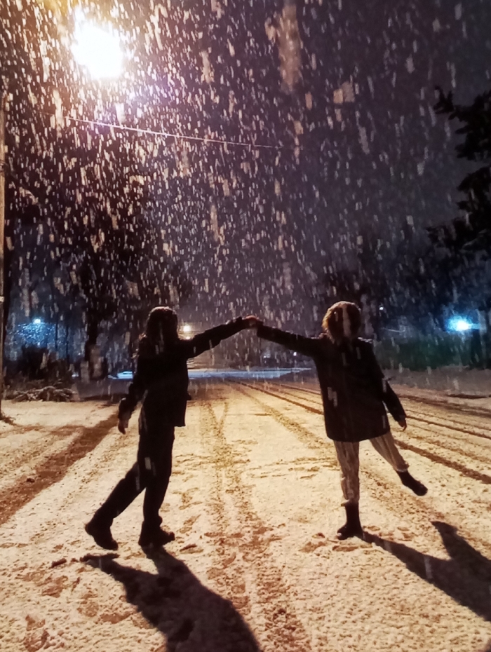Two people stand in the middle of a snow-covered road, facing away from the viewer and joining hands. Heavy snow falls around them, illuminated by a streetlight overhead. The road, marked with tire tracks, stretches into the darkness, flanked by trees on either side. Shadows of the figures are cast on the snow-covered ground. The scene conveys a sense of joy and togetherness amidst a winter snowstorm.