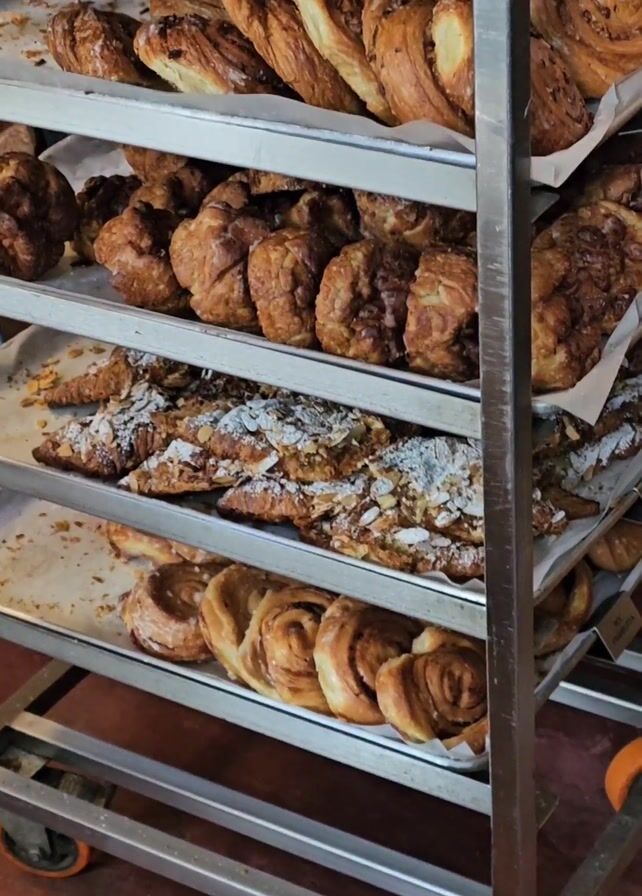 The camera pans upwards showing a stainless steel bakery cart filled with pastries