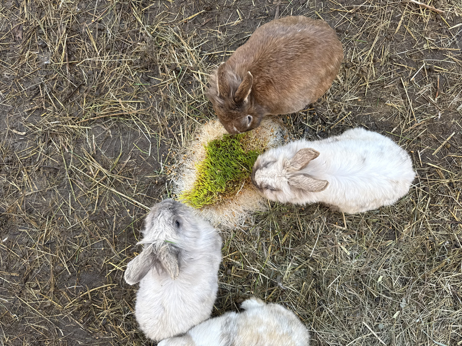 - "An overhead view depicts four domestic rabbits clustered around a central pile of feed on a dirt ground mixed with dry straw and organic debris in the city of Shakhty, Russia" by FM-RJWfF2, licensed under CC BY 4.0