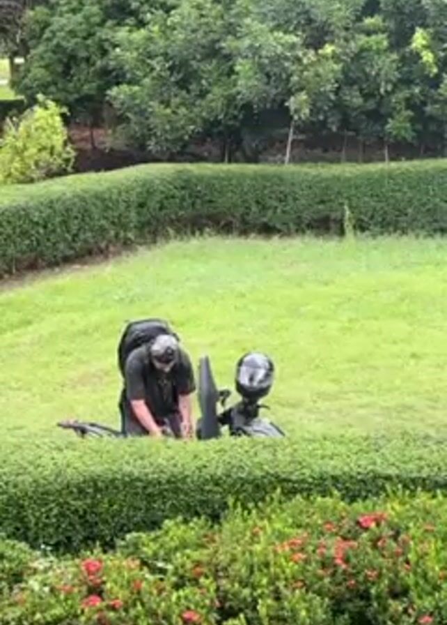 man in a black shirt and gray shorts, wearing a backpack and sunglasses, standing in a grassy area surrounded by hedges and working on a downed motorcycle. A helmet sits on the seat of the motorcycle. The man appears to be adjusting something near the front of the bike. The surrounding environment includes trees and a well-maintained garden.