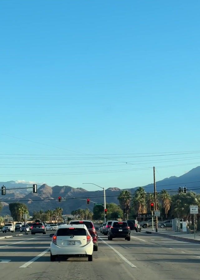 busy street in Palm Springs, California, with traffic stopped at a red light