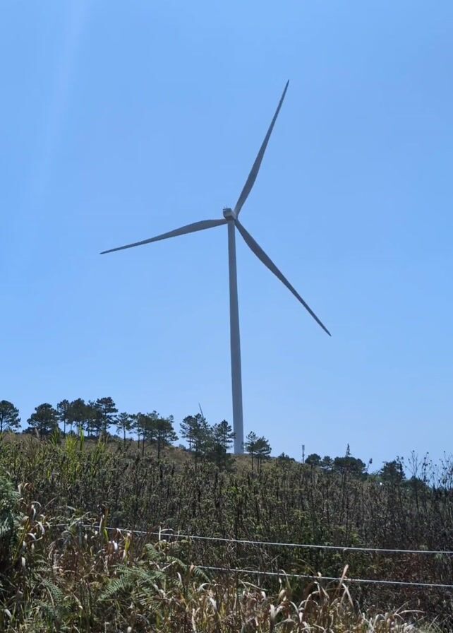 A single wind turbine stands on a hillside beneath a clear blue sky. The turbine has three blades that are actively rotating. The hillside is covered in low-lying vegetation and scattered trees. A wire fence is visible in the foreground. The scene is shot from a low angle, looking up at the turbine.
