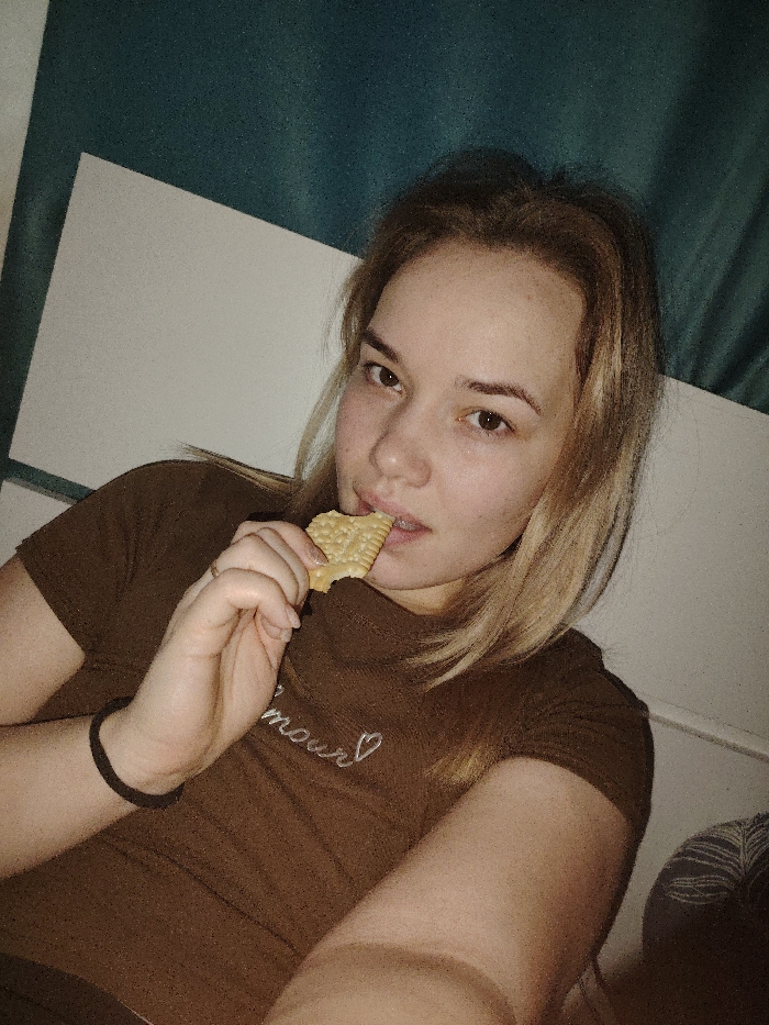 A young woman with blonde hair eats a cracker. She is wearing a brown t-shirt with "l'amour" written on it. The background consists of a white and green wall. She has a black bracelet on her left wrist. Her skin appears fair, with visible freckles. Her expression is relaxed as she looks directly at the camera.