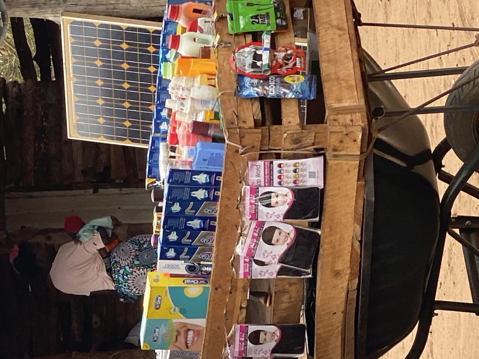 In Okura, Nigeria, an outdoor vendor's stall is depicted. A woman, wearing a light-colored top and a patterned skirt, holds an infant clad in a light blue outfit with a red cap, standing within a dark, rustic wooden structure in the background. The foreground features a merchandise display constructed from stacked wooden pallets, supported by what appears to be a wheelbarrow chassis with a single wheel visible. The top tier of the display holds various products: * On the left, multiple yellow and light blue boxes of "Oral-B" brand oral hygiene products are visible. * To their right, a row of blue boxes, possibly "Oral-B" toothbrushes or similar items, are stacked. * The center and right side of the top tier showcase an assortment of small plastic bottles in various colors (blue, red, pink, clear, yellow, orange), likely containing lotions, oils, or other liquids. * Behind these bottles, a rectangular solar panel with dark cells and a light frame stands upright. The lower tier of the display contains: * On the left, several clear plastic packages labeled "Wig Cap" and "Wig World," displaying images of models with various hairstyles and wig cap colors. * On the right, items such as a blue package of "Dolco" candy, red and silver foil packages, and a green package labeled "realme 2A FAST charger" are visible. The ground beneath the stall is unpaved, consistent with dirt or sand.