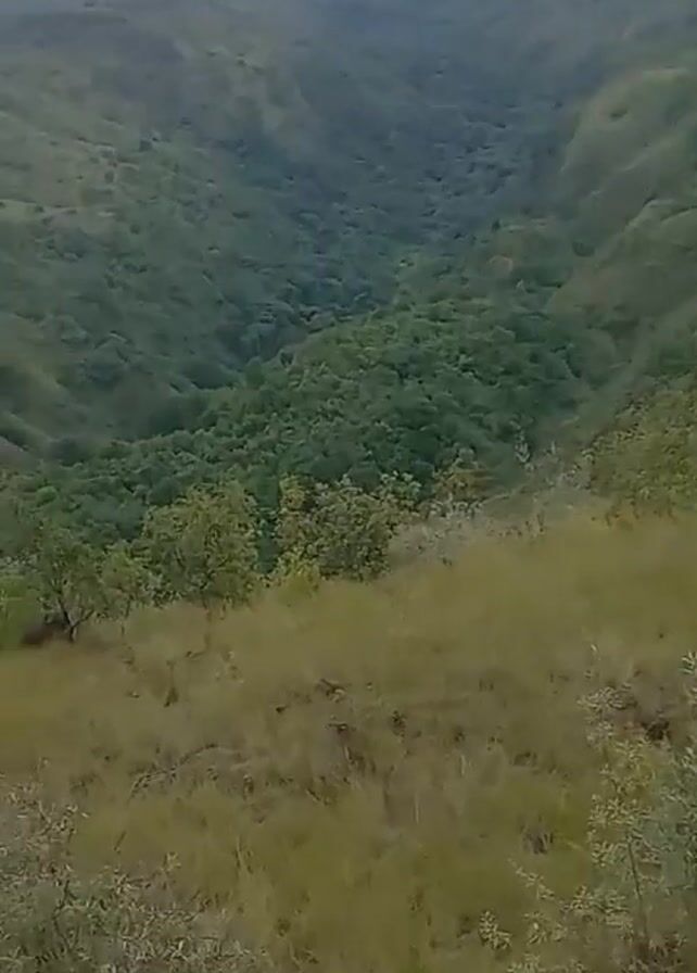 The camera pans across a green, hilly landscape under a cloudy sky. The viewpoint is elevated, looking down into a valley filled with trees and vegetation. The foreground features dry grass and rocks.