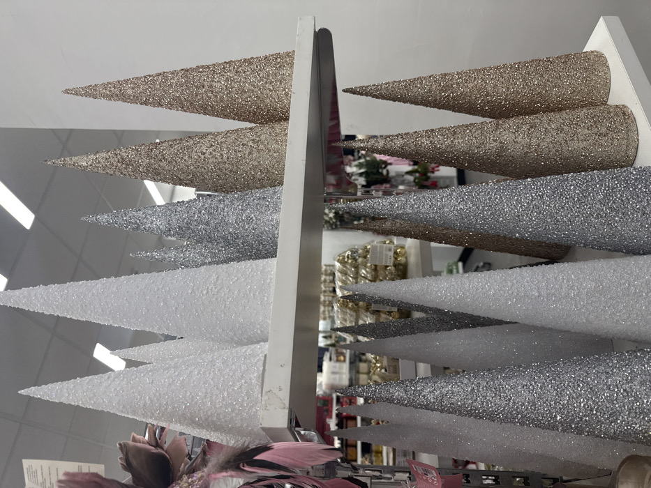 This image captures a retail display within a store in Mislata, Spain. Two white shelves are prominently featured, oriented horizontally. The upper shelf holds approximately seven glitter-covered, cone-shaped decorative objects in varying heights, displayed in white, silver, and gold/bronze colors. The lower shelf, positioned beneath the upper, presents a similar arrangement of approximately twelve glittered cones in white, silver, and gold/bronze. The texture of the cones is rough, consistent with applied glitter. In the background, additional retail merchandise is visible on other shelving units, including feathered decorative items on the far left and clear plastic packaging containing gold spherical ornaments in the mid-ground. The overall environment is illuminated by rectangular overhead light fixtures, typical of a commercial retail space. No individuals, dynamic actions, or direct interactions are depicted in the scene.