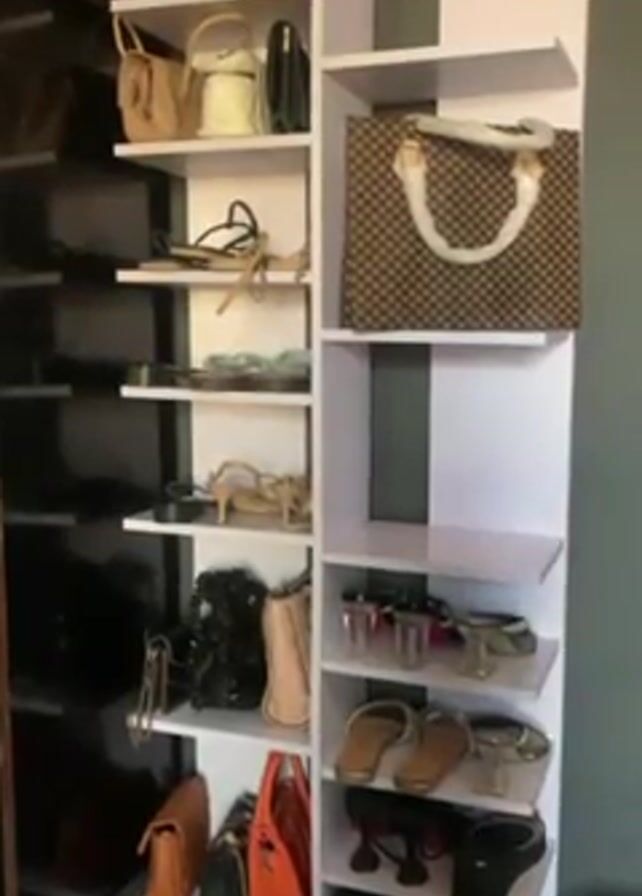 two tall shelves filled with purses and shoes