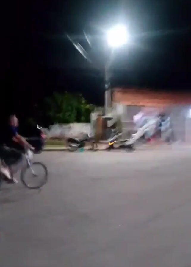 person riding a bicycle through a town at night. The road appears to be paved and well lit by streetlights. Several people are seen in front of a store. The camera focuses on the road ahead as the cyclist continues riding, passing parked cars and streetlights.