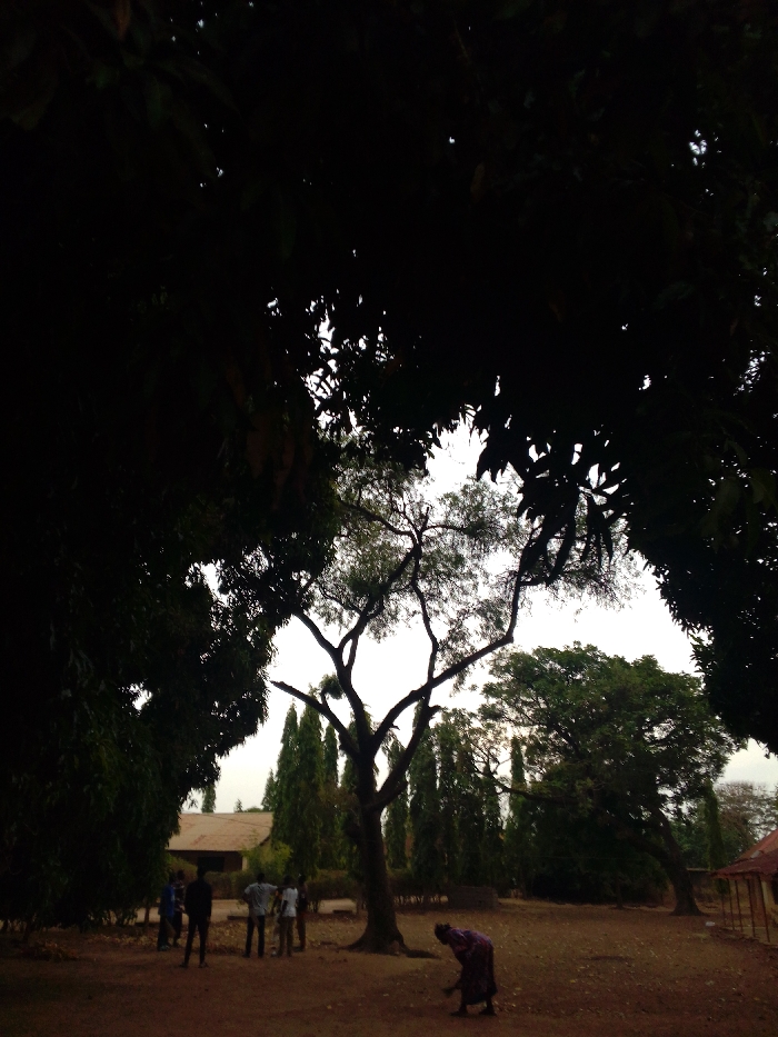 The image depicts an outdoor scene in Saminaka, Nigeria, under what appears to be overcast or twilight conditions, casting much of the foreground into shadow. The scene is dominated by varied tree foliage that frames the upper portion of the image. In the foreground, the ground consists of dry, reddish-brown earth. On the left mid-ground, a group of approximately five to six individuals, mostly silhouetted, are standing in a loose cluster, facing generally towards the right. Their specific actions or interactions are obscured by shadow. To the right of this group and closer to the foreground, a single individual, wearing a patterned garment, is bent over, facing downwards and to the left, appearing to be engaged with the ground. A prominent, large tree with a distinctive bare branch structure stands in the center mid-ground. Behind it, a line of tall, slender evergreen trees is visible. In the background, to the left, a light-colored building with a reddish-brown roof can be discerned. On the far right, a small, dark structure with a reddish roof is partially visible. The sky above is bright and overcast, providing a strong backlight that silhouettes the foreground trees and individuals.