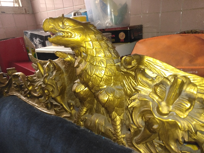 - "The image displays a detailed, close-up view of an ornate, gilded, three-dimensional sculpture of a mythical winged creature, resembling a griffin or feathered dragon, prominently featured on what appears to be a dark blue upholstered furniture piece, likely a bed frame or headboard" by FM-f7oWW2, licensed under CC BY 4.0