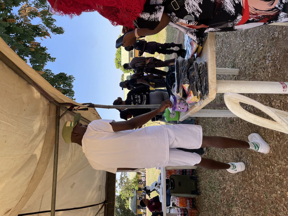 An outdoor scene in Unguwar Shanu, Nigeria, depicts a gathering under a light-colored canvas tent on a sunny day. In the immediate foreground, a tall, dark-complexioned male stands with his back partially to the viewer, wearing a white t-shirt, white shorts, white sneakers with green-striped socks, and a light green baseball cap. He is positioned behind a light-colored plastic table, reaching with his right hand toward small green and purple containers on the table. The table holds stacks of merchandise, likely apparel, individually wrapped in black packaging with colored labels. To the right, a partially visible female, wearing a red head covering and a black, white, and red patterned garment, holds a dark-colored smartphone in her right hand, viewing its screen. In the mid-ground, under the tent and extending into the open, several individuals are present. One person on the far left is seated next to a white scooter. Behind them, another table holds bottled beverages and a dark green rolling suitcase. Further back, a group of people, some wearing black t-shirts (one visibly displaying "Do Ar. Eat. Repeat."), and others in what appears to be dark uniforms, are standing and interacting. The ground is dry earth and sparse grass. Beyond the tent's shade, the sky is clear blue, and trees with brown seed pods are visible, along with distant low-rise buildings. The scene suggests a community event or market stall.