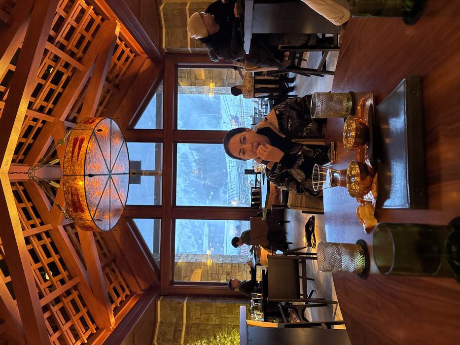 Inside a warmly lit restaurant with wood beams, a woman sits at a table with drinks and a menu, glancing at the camera. Beyond her, large windows reveal a snowy outdoor scene. Other patrons occupy tables in the background. A decorative chandelier hangs from the elaborate wooden ceiling structure. The table features glasses and a dark rectangular object. The overall setting evokes a cozy and luxurious atmosphere.