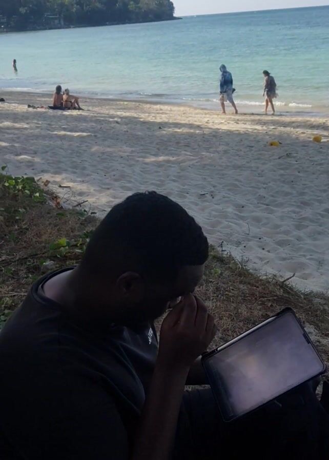 A man is sitting on the beach near some vegetation, using a tablet, which rests on a black backpack. He has short black hair and a light beard. He is wearing a dark grey t-shirt. He appears to be listening to something, perhaps audio, and turns to face the camera, smiling briefly. Behind him, people are walking and sitting on the sandy beach, with clear blue water and sky visible in the background. There is a forested area to the left side of the beach.