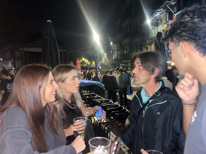 This nighttime image depicts a social gathering on a crowded street in Porto, Portugal. In the immediate foreground, four individuals are positioned around a surface, likely a table. On the far left, a young female with long, reddish-brown hair smiles broadly, looking towards the right while holding a clear plastic cup with a straw. Adjacent to her, a young blonde female, wearing a dark top, holds a clear plastic cup containing a green beverage with a straw in her right hand, and a blue object in her left, her mouth slightly open as if speaking or reacting. To her right, a middle-aged male with dark, medium-length hair, wearing a dark blue zip-up jacket over a light blue shirt, looks upwards and to the left with an open mouth, appearing to be in conversation. On the far right, partially visible, is the side of a young male's head and his right arm, with his hand clenched near his chin, looking towards the group. The middle ground features numerous stacked black chairs and large, retracted black market umbrellas, indicating an outdoor dining or bar area. The background shows a bustling street populated by many blurred individuals and lined with multi-story, classically styled buildings, illuminated by prominent streetlights and internal building lights, consistent with a vibrant urban night scene.