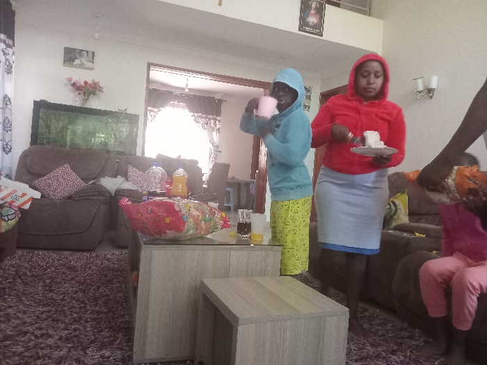 The scene is identified as being in Syokimau, Kenya. The image depicts an indoor domestic setting, specifically a living room, furnished with brown plush sofas and a dark purple shag rug. Two light-colored, multi-tiered coffee tables with glass surfaces are positioned in the foreground. On the larger coffee table, a clear bag of colorful snacks, two plastic bottles containing dark and orange liquids respectively, and a glass with an amber liquid are visible. Three adults and one child are present. A person on the left wears a light blue hooded sweatshirt and yellow patterned trousers, holding a pink mug to their mouth. To their right, a person in a red hooded sweatshirt and a light blue skirt holds a white plate with a slice of white cake and a fork. On the far right, a partial view of an adult's arm in an orange and brown patterned garment is seen, reaching towards a child seated on a brown sofa. The child is wearing a pink top and pink trousers. The room's walls are light-colored, adorned with a framed religious image above an archway in the background, another framed picture on the left wall, and two wall sconces on the right. A large, dark-framed aquarium is situated behind the left sofa. Pink artificial flowers in a vase are visible on a side table on the left. Patterned curtains are present on a window on the left and around the background archway. The scene is well-lit, indicating daytime.
