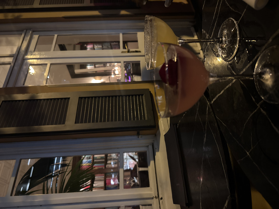 The image depicts a nighttime scene from an outdoor vantage point, looking into an interior space of a establishment in Tel Aviv, Israel. In the immediate foreground, a dark, glossy table with white veining, resembling black marble, holds two coupe-style cocktail glasses. The glass on the left contains a dark pink liquid and is garnished with a single red spherical object, likely a berry. The glass on the right holds a pale yellow or light orange liquid, and its rim appears sugared or salted. Condensation rings are visible beneath both glasses. To the left of the pink cocktail, a stack of dark folded napkins or a menu rests on the table. Beyond the table, two large, white-framed windows with dark, louvered shutters provide a view into the interior. Through the left window, a vibrant bookshelf densely packed with books of various colors is clearly visible. A large, dark green plant, possibly a palm frond, partially obstructs the view within this window. A blurred human figure is faintly discernible inside, seated at a table. Through the right window, more bookshelves are visible, along with ambient lighting sources such as a chandelier or sconces, and reflective surfaces, suggesting a library-themed bar or restaurant. The overall lighting is dim, emphasizing the illuminated interior and creating reflections on the window panes.